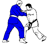 et l'extérieur, avec son pied, il fauche la jambe gauche de Uke comme pour l'écarteler.