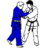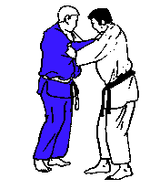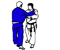 Tori tire Uke vers l'avant des deux mains, la droite ayant saisi le col de Uke haut derrière sa nuque.